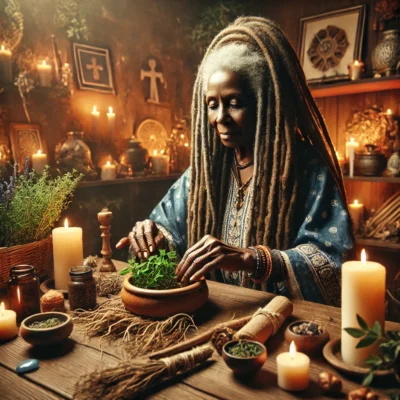 It involves working with natural elements like herbs, roots, and minerals, often used in rituals to influence energies, connect with spirits, or manifest intentions.